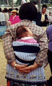 But strollers haven't yet fully replaced the old way. Traditional Koren moms still carry their young ones on their