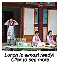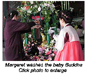 Oh, and they'll feed you. Everybody gets lunch - no charge. Imagine how much work goes into fixing that meal. No doubt there are thousands of Koreans who otherwise never go near a Buddhist temple, but they'll go for the free food on the Buddha's Birthday. Of course you'll get a big dose of lanterns, hung in string after string across the temple yard. The ones we've seen in recent years are still nice to see, but not quite as colorful or varied as the ones in Margaret's picture above (shot in 2000, at one of the temples in the mountains near Kangnung). Nowadays most of them are mass-produced in China, instead of being handmade.