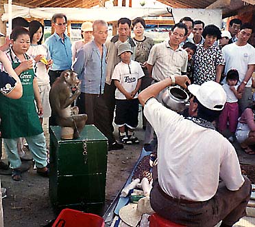 in the GDP department, though, Koreans can afford a little companionship. Small dogs are the hands-down favorite. Cats have gained some ground in the last 5 years or so, but a lot of Koreans are still actually afraid of them. Now and then you'll see a street vendor selling sad-looking rabbits or hamsters in cages. And here we have a chimpanzee. This fellow and his less-furry friend were selling lotus seed at the Tano Festival (Gangneung Dano) in June of 2000. Koreans are endlessly health-conscious despite -- or maybe because of -- the air pollution that surrounds them in Seoul and other large cities. This chimp drew a pretty good crowd with his person's claims that his tonic would clean out all those impurities and poisons.