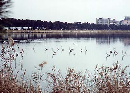 Margaret spotted the cranes on Kyongpo (Gyeongpo) Lake very early in her stay in Kangnung (Gangneung). For months she tried to snap a photo, but they were always too shy. In January of 2001, her time in Korea was running out. But she had a new camera with a zoom lens. Finally, she caught these graceful birds on film.
