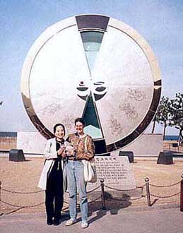 Democratic Party (fairly successful until they crumbled from infighting and scandal). For once, here's a millenial item that deserves its name. The first grains of sand trickled through the Millenium Hourglass on the first of January, 2000, marking the days and hours to the new millenium on the first of January, 2001. It's made of stainless steel. The symbols round the clock's "face" are the Chinese zodiac signs. When this photo of Margaret and her friend TJ was shot in March, 2000, it looked like the glass was running just about on time -- you can see that almost a quarter of the sand has run through. It stayed on time, too. Margaret was at Jeong Dong Jin again on New Year's Eve, this time with her friend Christine, to watch the sand run out and to see the hourglass turn over.