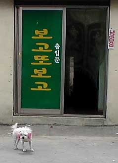 animals tend to go for dogs rather than cats. Size matters, though -- a lot. This probably figures in a country that crams the populations of New Hampshire, Massachusetts, Connecticut, New York, New Jersey, and Pennsylvania onto a piece of land about the size of Indiana. Medium and large dogs are put to work as guards or (I'm sorry to say) end up in the stew pot as boshintang. What Koreans want for pets instead are small, purebred dogs. And they dote on them, carrying them around like babies and grooming them fastidiously. Check out the pink ears on the pup above. If you have a dog, you know how much cleanup they call for. I'm not just talking about pooper scoopers. In and out, in and out, they track in mud and dirt by the cubic meter. This has to be torture for Koreans, who try to keep their homes spotless. Maybe that's why they seem to carry their dogs everywhere. In high-tech Japan, where they're at least as fussy about cleanliness, the answer is bizarre electromechanical robot dogs. Korea's lower-tech response is dog cafes. No, not boshintang restaurants. Think internet cafe, but with pooches instead of PCs. But for the most part, Koreans simply deal with the extra chores and expense. That's the price you (usually) pay for companionship. And who knows -- maybe as they think more of dogs as pets, they'll think of them less as food. |