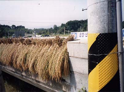 do about big agribusinesses? How much do we want to rely on imported food? The fact that Korea is tiny makes this all the more complicated. They have 50 million people to feed in a country a bit larger than Indiana. Laws are supposed to keep farmland from being developed into housing and retail, but they don't always work. What you see above is part of what they do for the little guys. They don't make a fuss when private farmers dry their rice on the guardrails next to the highway, and home gardeners dry peppers on the city sidewalks. Is this a good thing? Yes and no. I'm not so sure I like the idea of my food sitting in the clouds of exhaust and dust from passing cars and trucks. But maybe this isn't for human food use, and at least they're using solar energy. And remember, it's a crowded country. Where else are they going to put it?