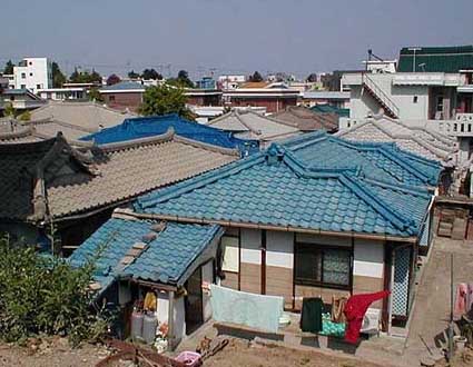system. By the end of the 20th century, in spite of efforts to save them, most of the hanok had disappeared. Except in historic re-creation villages such as Hahoe Folk Village, they gave way to yangok, modern western-style apartment buildings, in large, practical blocks. I guess it's what Korea needs, given their thick population density; but I have to say that most of it is institutionally, deadly dull. The other place you can still find some older houses and neighborhoods is in the smaller cities, and Kangnung (Gangneung) definitely qualifies. That's where I shot this picture in May of 2000. The neighborhood and the same house were still there -- and not much changed -- when we visited in 2006. There's also a small but growing fashion for wealthy Koreans to build new hanok. This is pretty ironic, since most Koreans think of hanok as old, run down housing for poor and elderly people -- but it's expensive to build them the traditional way, and they take a lot of upkeep. Hanok now even have their own organization in Seoul, the Hanok Institute, founded in 1999 by two experts who've studied traditional Korean house construction.