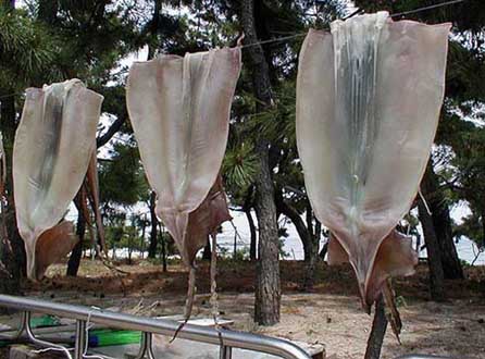 Squid are everywhere in Korea. They even show up in the packets of salty powder for instant ramyan noodles. There's one over there to the left. Quite the character, isn't he? (Ramyan are about as popular in Korea as ramen in the US, but they come in a larger package and have more packets with extra goodies, such as dried vegetables and a bit of oil. They also cost more, but they're hardly what you'd call expensive.) In the photo above, squid are drying in the sun along the road near Kyongpo Beach (Gyeongpodae). You can just see the ocean through the trees. In Korea you often see public rights-of-way used for drying fish (or peppers or straw or what-have-you). This is just the way things work in a small nation where there isn't a lot of land available for private use.