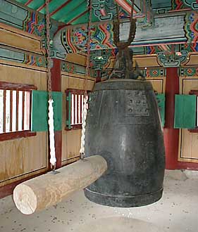 inside. Not Buddhist temple bells. They're rung with huge hammers. This bell and its hammer are at Sangwon-sa Temple in Odaesan National Park. It's the oldest bell in Korea, cast in copper in 725 - 1,300 years ago. In those times, Korean bell-making was a highly developed craft. Koreans claim that their bells were considered the best in the world, valued above both Chinese and Japanese bells. This one is decorated with a lotus pattern, which seems appropriate since the lotus is a major Buddhist symbol. It also has images of heavenly musicians, which strikes me as oddly western. Buddhist tradition says that this bell sounds like the growling of a beast. I don't hear that, but then I know only a few beasts, and most are smaller than this bell. Because it's now a Korean National Treasure (#36) it's almost never rung any more, and you're unlikely to ever hear it in person. But we found a recording, so you can play the clip above and decide what kind of beast you think it sounds like. The bell has its own building for protection. I slipped the camera in past the bars in the windows to take the photo. Check out the coins on the floor. Some things are universal and international, I guess.