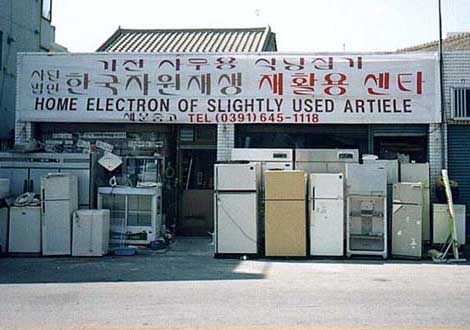 and India's economies have since shoved it down the ladder a couple of rungs.) This change hasn't been entirely without growing pains. For sure, the swings in Korea's economy are wider than they used to be. There's quite a bit of talk in the goverment about overconsumption, the savings rate is way down, credit card debt and default are up, and the gap between rich and poor keeps widening. Koreans just aren't as frugal as they once were. Our friend Mrs. Lee just shakes her head over the good, serviceable furniture and appliances she sees left for the trash collectors, because the owners are moving or just want something new. In most American cities, they wouldn't stay there long - someone would come along and trash-pick them. That still doesn't happen much in Korea. Quite a few Koreans - especially the older ones - still hear echoes of their ancient Shamanic religions. They have a vague, uncomfortable idea that using someone else's stuff will bring them the former owner's luck - good or bad. This notion may be the reason that theft is less of a problem in Korea. It's almost certainly the reason that stores like this one don't seem too common. But maybe the fact that Margaret found this one on a little Kangnung (Gangneung) side street in 2000 says something about the growing Western-style stresses on Korea's middle class. I suspect that poor Koreans are more aware of what they don't have than they used to be, and thus might be more willing to accept rich folks' castoffs. By the way, we wandered by in 2006, and this used appliance store was still there. Good thing Margaret snapped the pic in 2000, though, because in 2006 the Konglish sign was gone.