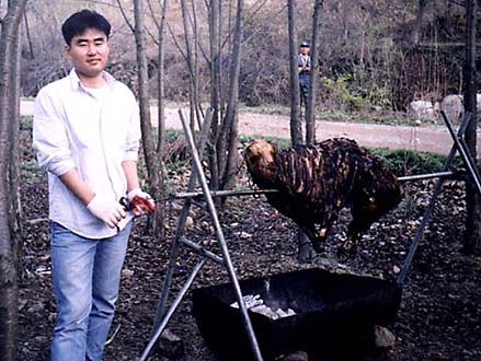I couldn't stay for the lamb dinner because I was concerned about missing the last bus home, and for lack of money to pay for the bus. But while I was talking to people around the fire quite a few of the younger ones spoke English), the chef came and cut off some meat and handed around samples. So I got a bit of lamb for Easter. The chef seemed quite good-natured, and had his picture taken countless times with various groups. Most Koreans seem to love taking pictures and posing for pictures, especially in groups. I was kind of watching the road, hoping someone would arrive by cab so I could take the cab back, but it started to look hopeless. So I asked the girl I was talking to if she could call a cab for me. She said that the chef, Hussein, was leaving soon, and she asked him if he could give me a ride into Inchon. He agreed, though he didn't seem very thrilled about the idea. His driver dropped me off by the bus stop, and I waited for the bus in the rice cake shop again. I got home about 12:30am.