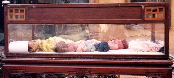 25 April: I've finally had a fiber contact! There was an article in the Korea Herald about the restaurant Damwon and its Magnolia Festival. The owner of Damwon is a fiber artist and was offering a public dyeing session. So of course I had to go. I tried to find someone to go with me, for interpretation as much as anything else, but everyone said it would be much too difficult. "If you live in Seoul, maybe," they all said, "but from Kangnung it would be impossible." So I set off to do it by myself. It made me think about the fortune teller I saw at Kyongpo Beach. He said I had the spirit of a man in the body of a woman, and I expect that's true by Korean standards -- although I'm sure it comes from being American more than anything else. Anyhow, I caught the bus from Kangnung to Seoul at 7 am. It took about 4 hours to get there, on roads (these were expressways, mind you) that would give West Virginia back roads a run for their money in terms of twists and curves. The buses are pretty comfortable, with a fair bit of legroom. There were even a few stretches that were straight enough that I could knit a little. When I got to Seoul, the next step was to find the subway. The subway station was conveniently located right across the street from the express bus station, and even better, it turned out to be the very station I was supposed to take the subway to. So I was able to bypass the subway altogether. Next step was to catch bus 133-1 to Toichon. So I walked around the building until I saw a bus stop, which had several busses lined up. None of them was the right number, so I asked one of the drivers where to catch #133-1. He was directing me around the corner when a passerby (they always seem to come along when I need them) asked where I was going. I showed him the article (it got a lot of use over the weekend) and he talked to the bus driver, and then said that bus went to Toichon. So I climbed on and off we went. It was about 30 or 45 minutes to Toichon, and the driver said I would have to change busses there. When I got off and he had turned the bus around, he also got off and led me to a rice cake shop and talked to the people there. They invited me in to sit down. I was glad, because it was getting cold and rainy, and I had forgotten my umbrella (it wasn't raining when I left Kangnung). I figured they would send me out when the right bus came along. Well, they did send me out, but it was when a taxi came along. There was another lady also going to Damwon, and we shared the cab. She shared her umbrella with me from the cab into the restaurant, too. I made better time than I'd expected. I had worried about getting there by 2, and we made it there around noon. So we had lunch together, and talked what little we could talk. She showed me a letter she had gotten from Damwon talking about the Magnolia Festival, and I showed her my article, and we compared the Korean and the English. She gave me her card (this is very common in Korea, but I have no cards to give in return). Her name is Kim Bo-Kan -- that much on the card is in English. She lives in Seoul -- that much is in Korean. The rest is in Chinese. Not only could I not read it, but nobody at the institute was able to read it all to me. All they could get was that she's a singer. She was very elegant and very nice. She's 74, and graduated high school in 1947, just 2 years after the end of the Japanese occupation of Korea. So all through school she was forced to study Japanese as a second language. She has 3 grandchildren. She talked a lot more than that, and unfortunately I understood very little of it. It made me wonder if the people I talk to understand as little of what I say.