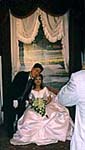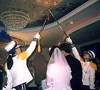 The wedding hall had its own beauty salon for the bride. Christina's hair was all done up, with I think some kind of fake hair added. Her face was all made up, and she had these huge false eyelashes. We hardly recognized her. The bride's dressing room was huge and ornate, with carpeting and crystal chandeliers. Christina was in the chair in front of an array of mirrors, getting her veil arranged and proper earrings chosen. Thus prepared, she moved to the bride's room, which was tiny. She sat at the end of the room facing out, under a canopy, and looked just like a princess waiting to receive her court. The whole wedding hall was set up that way -- as a little girl's fairy tale fantasy. After we paid our respects to Christina, we went into the actual wedding room to sit. It looked like a knock-off of Versailles, with pseudo-medieval European murals on one wall and a white and gold brocade carpet rolled out down the center aisle. There were colored spotlights on the wall, and they had cutouts with words rotating in front of them -- "best wishes," and the name of the hall, something-or-other Palace. There was a flower-covered arch at the back of the hall. Before the ceremony started, two girls in 18th century-ish military style uniforms came out and practiced raising and lowering their swords.